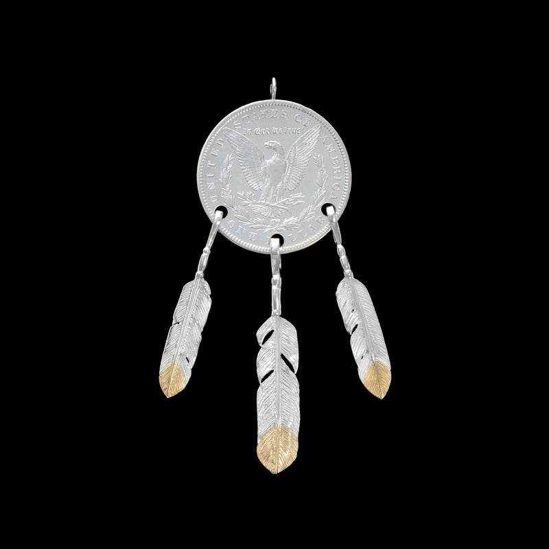 100年ほど前にアメリカで流通していた「モルガンダラー銀貨」にREDMAN.のフェザーを提げたトップ。