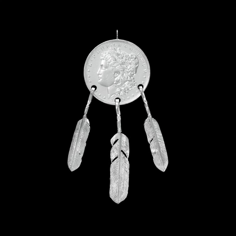 100年ほど前にアメリカで流通していた「モルガンダラー銀貨」にREDMAN.のフェザーを提げたトップ。