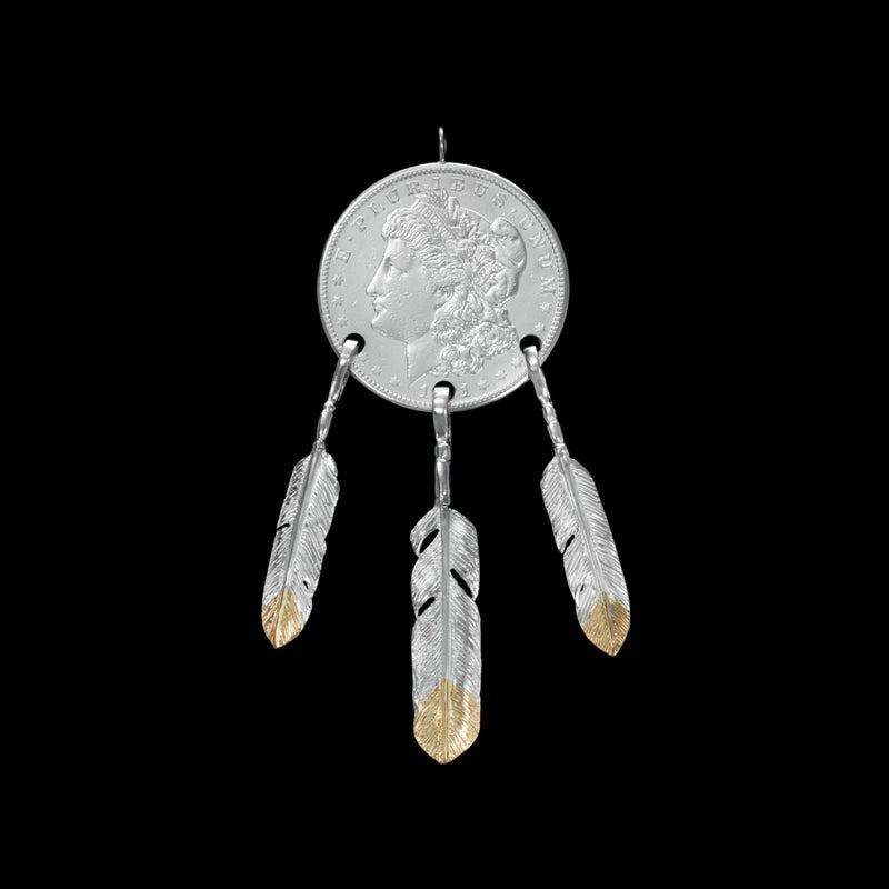100年ほど前にアメリカで流通していた「モルガンダラー銀貨」にREDMAN.のフェザーを提げたトップ。