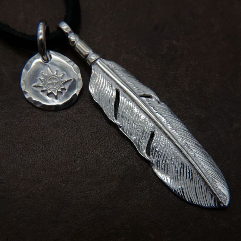 メタル付き 大フェザー左向き×小メタルチャーム×鹿革紐×アンティークビーズ/ネックレスカスタム
