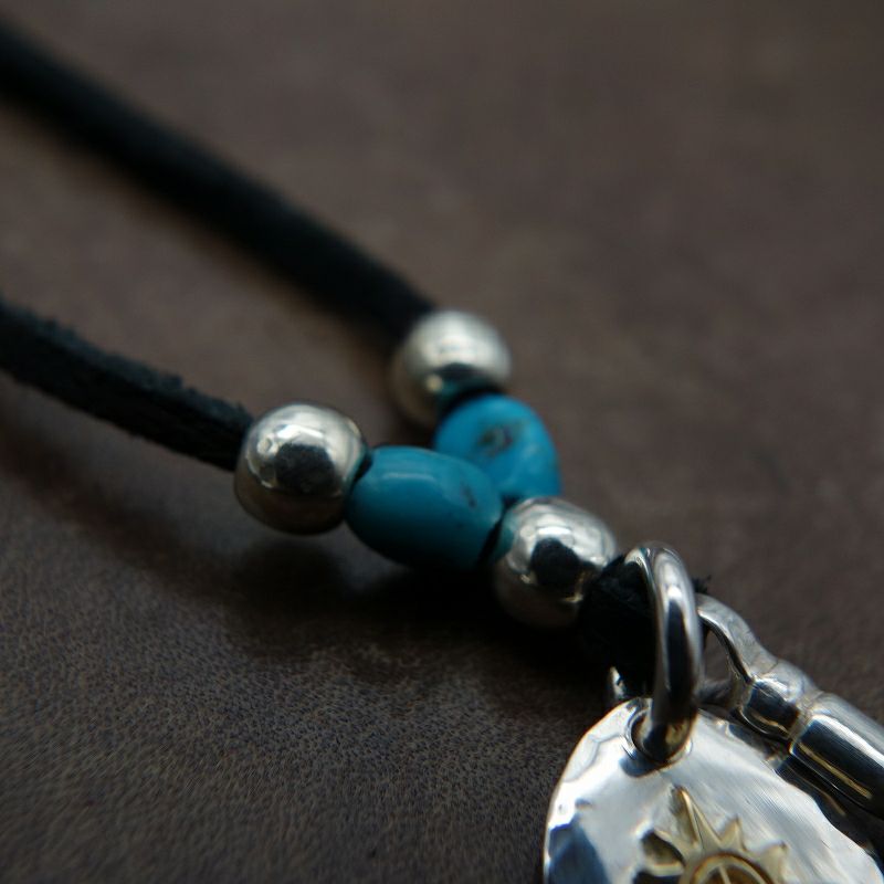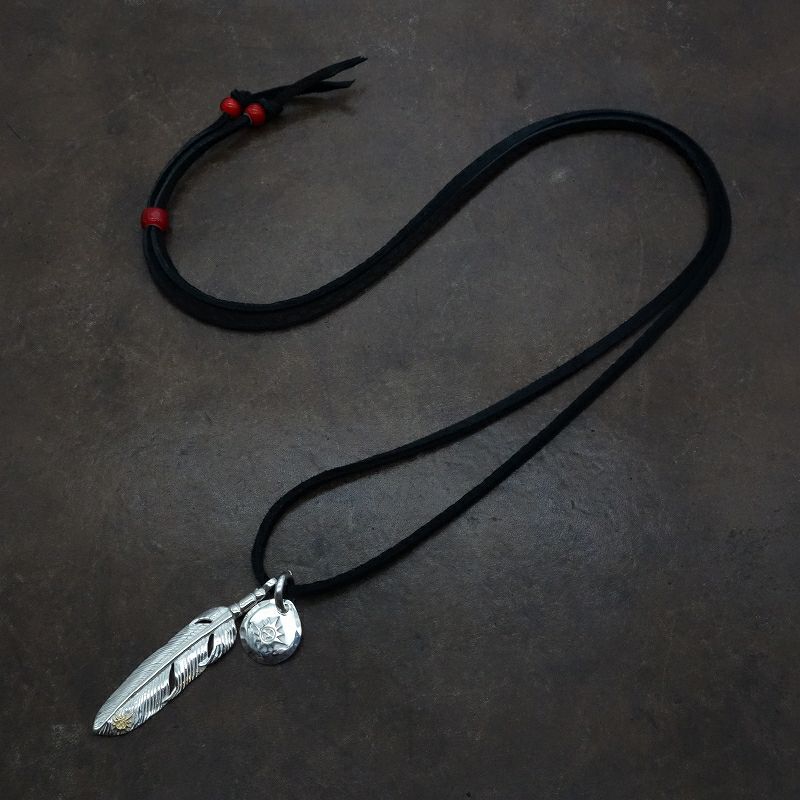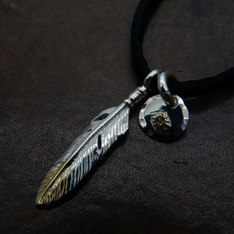 極小フェザー(コンビ)左向き×極小メタルチャーム(コンビ)×鹿革紐×アンティークビーズ/ネックレスカスタム