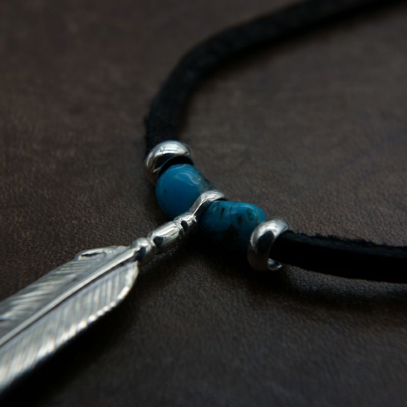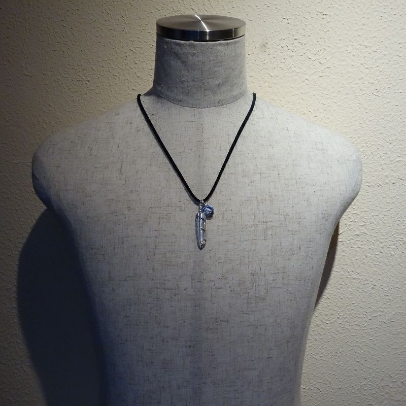大フェザー(コンビ)左向き×小メタルチャーム(コンビ)×鹿革紐×アンティークビーズ/ネックレスカスタム