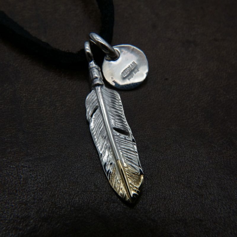 極小フェザー(コンビ)右向き×極小メタルチャーム(コンビ)×鹿革紐×アンティークビーズ/ネックレスカスタム