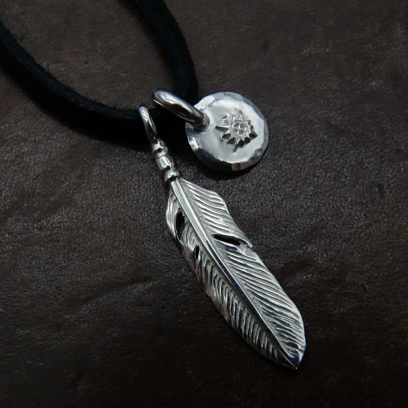 メタル付き 中フェザー左向き×小メタルチャーム×鹿革紐×アンティークビーズ/ネックレスカスタム