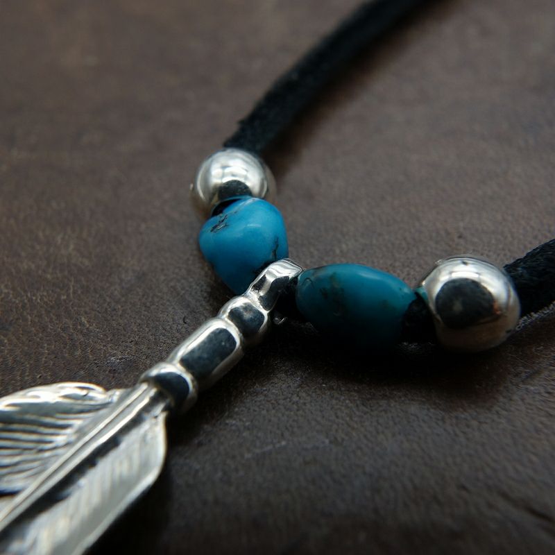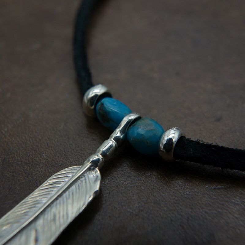 中フェザー右向き×小メタルチャーム×鹿革紐×アンティークビーズ/ネックレスカスタム