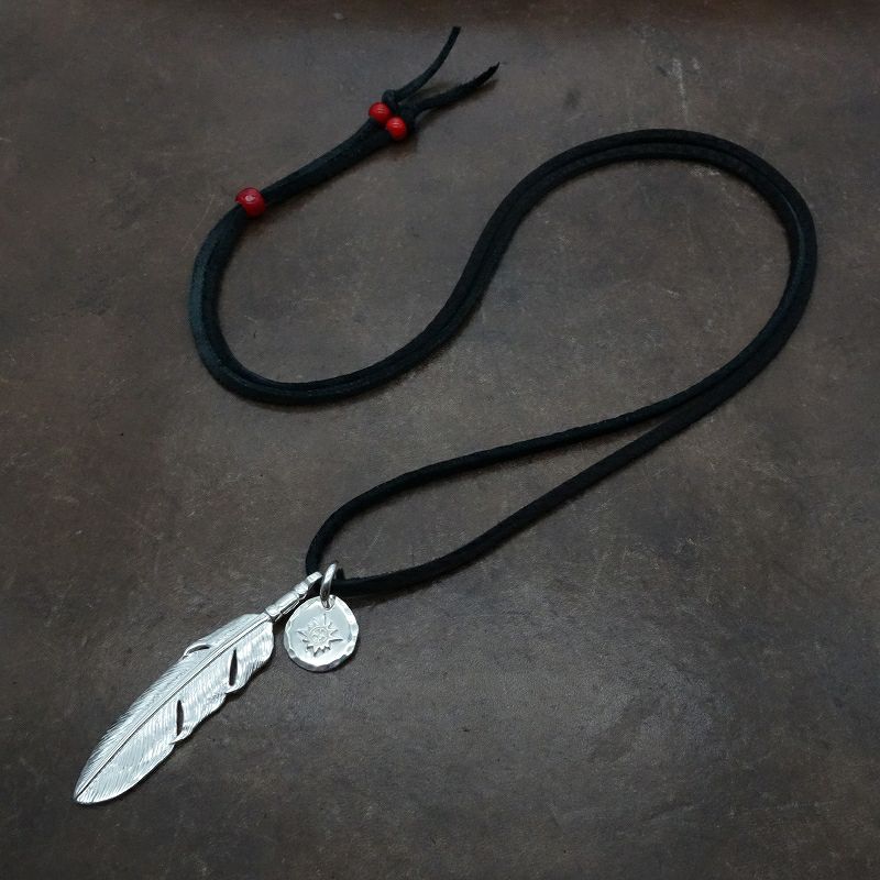大フェザー左向き×小メタルチャーム×鹿革紐×アンティークビーズ/ネックレスカスタム