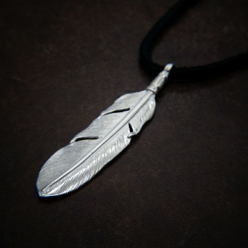 大フェザー(コンビ)左向き×鹿革紐×アンティークビーズ/ネックレスカスタム