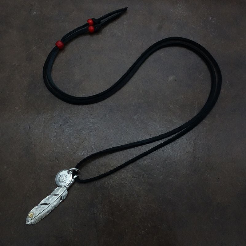 5. メタル付き 中フェザー右向き×小メタルチャーム×鹿革紐×アンティークビーズ/ネックレスカスタム