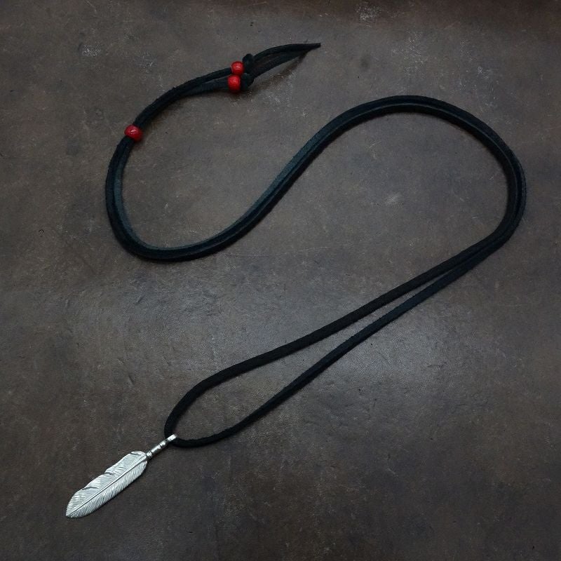 中フェザー左向き×鹿革紐×アンティークビーズ/ネックレスカスタム